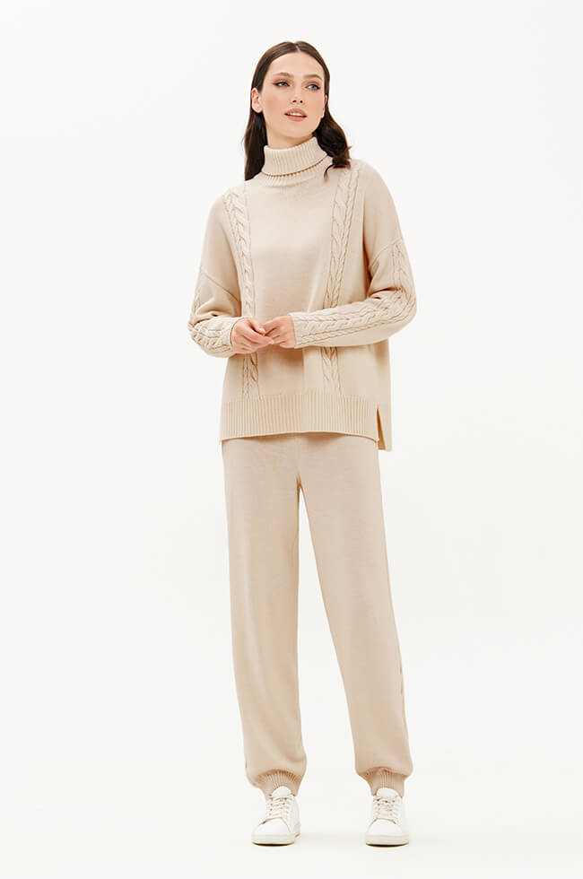 — брюки декорированы вывязанными лампасами с рисунком «Косы»: добавляют уникальности и изысканности образу.