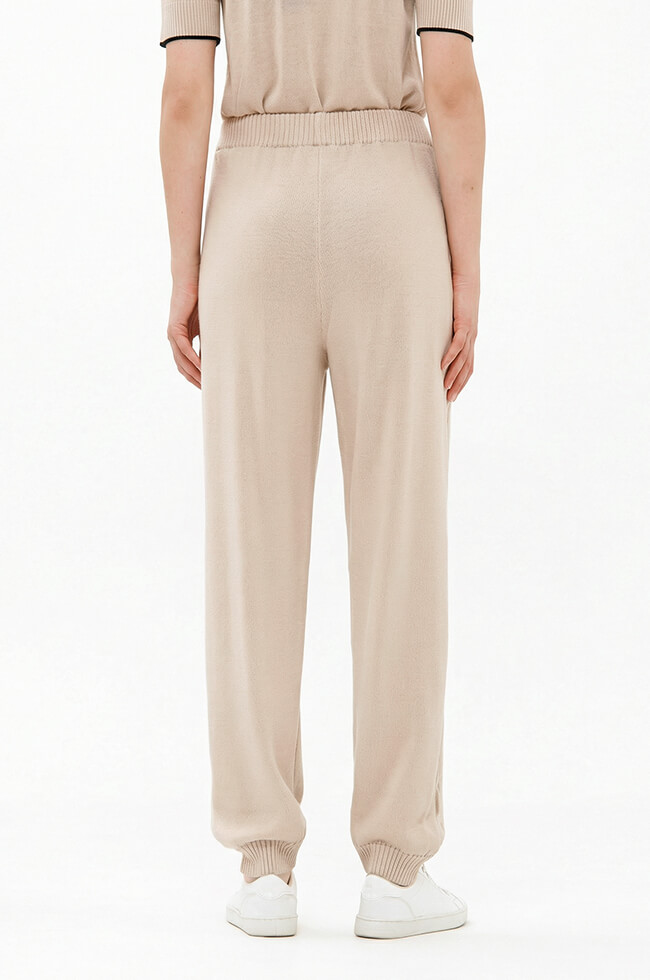 — по низу сосборены на вывязанную резинку: добавляет эстетическую завершенность и стильный акцент, позволяя носить брюки с высокими ботинками;